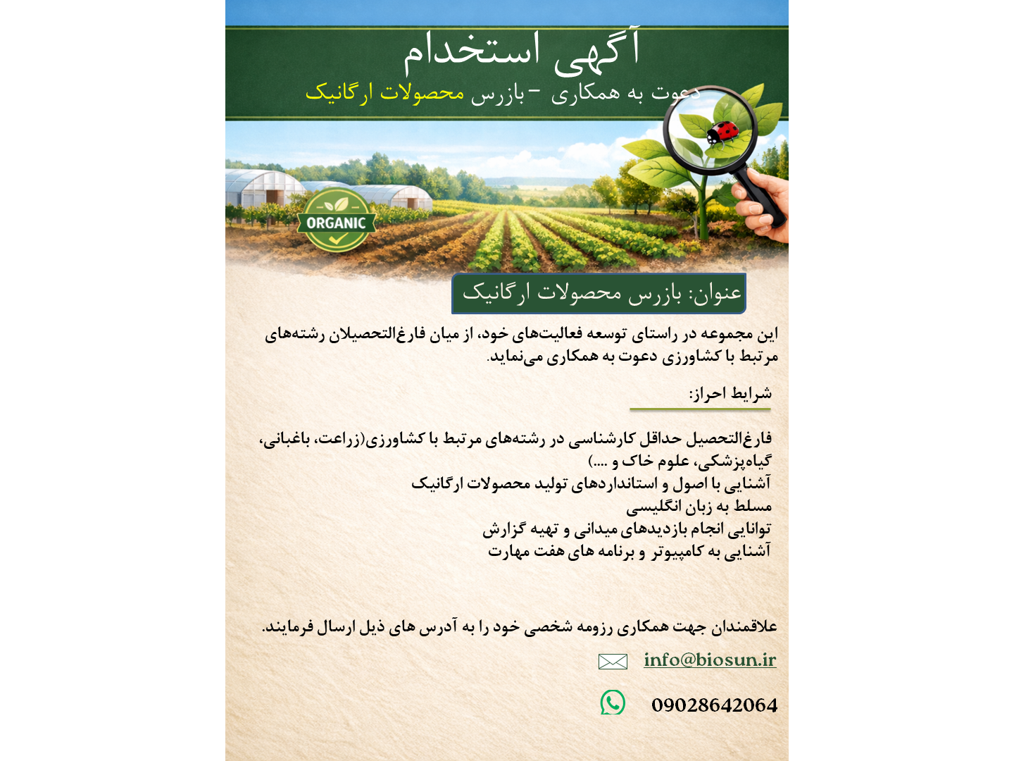 دعوت به همکاری بازرس محصولات ارگانیک این مجموعه در راستای توسعه فعالیتهای خود، از میان فارغالتحصیلان رشتههای مرتبط با کشاورزی دعوت به همکاری مینماید. علاقمندان